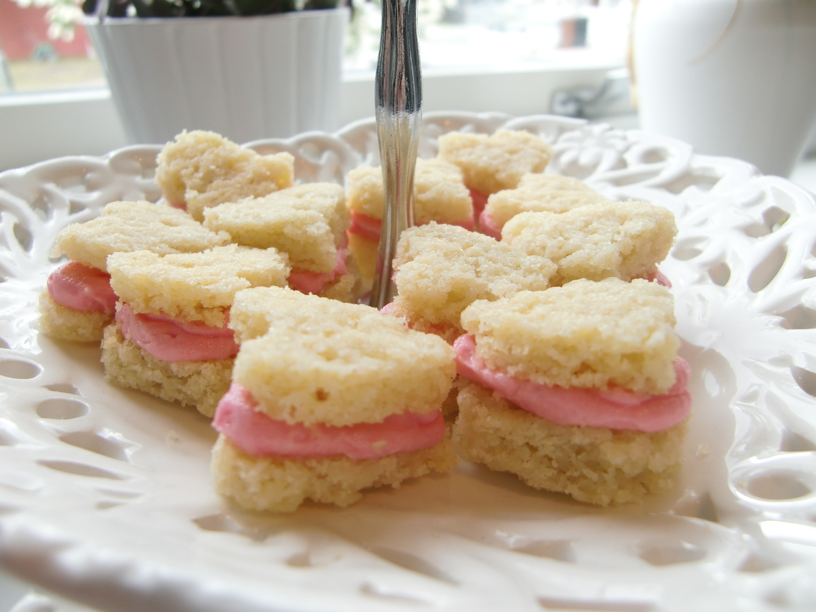 Av misslyckade kakor fick jag ut dessa söta hjärtan. Kakorna jag skulle göra först flöt ut på plåten men eftersom kakorna var lite mjuka så gick det jättebra att trycka ut små hjärtan med en pepparkaksform. Spritsade sedan ut smörkräm mellan, färgade med röd karamellfärg.