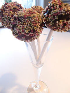 Ställ in i frysen och låt kallna i ca 30 minuter. Smält mer blockchoklad/vit choklad och doppa klubborna i chokladen. Var sedan snabb med att rulla i strössel för chokladen stelnar fort.