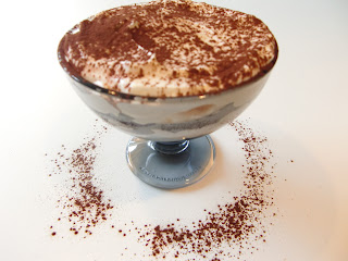 Blanda 4 msk kaffe tillsammans med 1,5 msk likör. Lägg sedan ett lager Savoiardkex (12 st) i botten av en medelstor glasform. Droppa sedan kaffe/likören på kexen men inte för mycket så den blir för blöt. Bred sedan hälften av krämen på kexen och gör sedan ett till lager med kex och kaffe/likör. Avsluta med kräm och pudra över kakao. Låt stå i kylen några timmar innan servering!